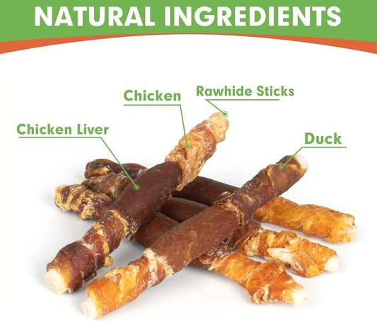Triple Flavor Rawhide Dog Treats 5” Chicken, Duck & Chicken Liver Sticks